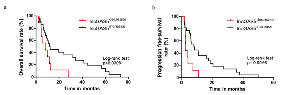 Decrease of circulating levels of GAS5 is associated with the worse patient outcome. Patients with decreased circulating GAS5 after chemotherapy had a shorter overall survival (a) and a shorter progression-free survival (b).