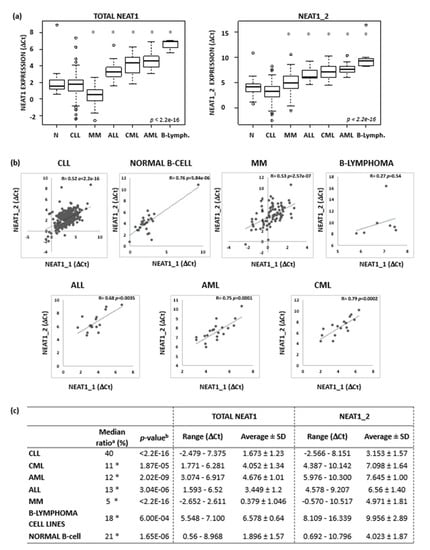 NEAT1 and NEAT1_2 expression levels in normal B-cells and in B-cell malignancies. (a) Boxplots of NEAT1 and NEAT1_2 expression levels evaluated by qRT-PCR in 27 normal B-cells, 310 CLL, 82 MM, 16 ALL, 16 CML, and 20 AML samples, and 7 B-lymphoma cell lines (OCILY7, MAVER1, JEKO, MINO, SULTAN, P3HR1, and NAMALWA). Expression data are reported as Ct referred to GAPDH housekeeping gene. Significant differences versus CLL group are indicated by an asterisk (Benjamini-Hochberg adjusted Dunn’s test, p < 0.01). (b) Pearson’s correlation on NEAT1_1 (x-axis) and NEAT1_2 (y-axis) expression level expressed as Ct. NEAT1_1 expression values are inferred as described in Appendix B. Correlation coefficient and p-values are reported in each plot. (c) Ratios of NEAT1_2 and total NEAT1 expression level; range, average and standard deviation are reported for each group. a Median value of the ratios of NEAT1_2 and NEAT1 expression level evaluated for each sample in the specified subgroups. Significant differences versus CLL group are indicated by an asterisk (Benjamini-Hochberg adjusted Dunn’s test, p < 0.01). b Significant differences of NEAT1 and NEAT1_2 expression levels (Wilcoxon test).