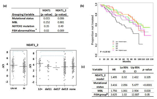 Lastly, we correlated NEAT1 expression levels with time to first treatment (TTFT) as clinical outcome. To this end, patients were subdivided into sextiles based on global NEAT1 or NEAT1_2 specific expression by leukemic cells. We found that NEAT1 expression was not associated with prognosis. Patients with the lowest NEAT1_2 expression (1st sextile) displayed the shortest TTFT if compared with all the other samples (Figure 2b); however, a multivariate regression analysis showed that the NEAT1_2 risk model was not independent from other known prognostic factors, particularly the IGHV mutational status (Figure 2c).
