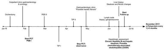 Overview of the treatment timeline including biopsies, clinical re-evaluation and follow up. (PCT = polychemotherapy; PEB = cisplatin, etoposide, and bleomycin; TIP = paclitaxel, ifosfamide and cisplatin).