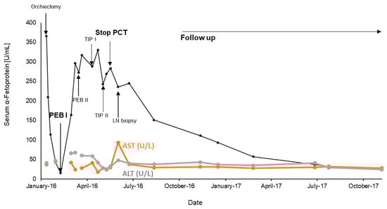 Serum levels of α-Fetoprotein and liver enzymes (AST and ALT) during treatment and further development after finishing of chemotherapy including follow-up (PCT = polychemotherapy; PEB = cisplatin, etoposide, bleomycin; TIP = paclitaxel, ifosfamide, cisplatin; LN = lymph node).