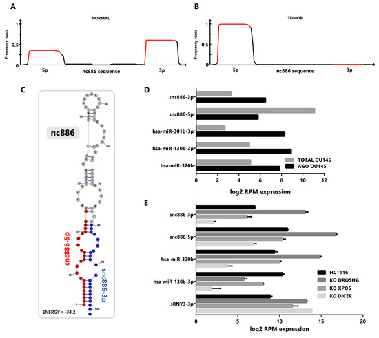 Figure 1. nc886 derived fragments are produced in prostate cell lines and exhibit microRNA features. (A,B) Mapping of prostate cell small RNA reads along the sequence of nc886. Reads obtained from small-RNA transcriptomes of non-transformed prostate PrEc and PrSC (GEO id: GSE26970) (A) and tumor DU145, PC-3 and LNCaP cell lines (SRA id: SRP109305 and GEO id: GSE66035) (B) were mapped to nc886. A diagram of nc886 (Refseq (NR_030583.2)), plus additional 10 nt at both ends, is depicted below the plots. Red lines in the plots represent the previously annotated hsa-miR-886-3p and -5p. (C) Predicted secondary structure of nc886 (Refseq (NR_030583.2)) based on maximum free energy (MFE) generated with the RNAstructure software [44]. (D) Association of small RNAs to Argonaute in transcriptomic analysis of DU145 cell line. The graph shows the normalized expression, reads per million (RPM), of small non-coding RNAs in total cellular RNA (TOTAL DU145) and in the Argonaute PAR-CLIP fraction (AGO DU145). Data set available at SRA id: SRP075075. (E) Transcriptomic analysis of small non-coding RNAs of the HCT116 cell line with knockouts for the microRNAs biogenesis proteins DROSHA, EXPORTIN 5 and DICER. Data set available at GEO id: GSE77989. Average value and standard error are shown.