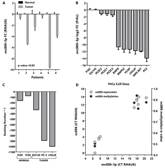 The following are available online at https://www.mdpi.com/2311-553X/6/1/7/s1, Figure S1: nc886 derived fragments are produced in non-prostate cell lines and exhibit microRNA features, Figure S2: Candidate target gene expression of snc886-3p in DU145, LNCaP and DU145, Figure S3: High expression of 106-snc886-3p direct targets correlates with nc886 promoter methylation in prostate tissue, Figure S4: High expression of 106-snc886-3p direct targets correlates with nc886 promoter methylation in prostate tissue, Figure S5: Sequencing reads alignment to nc886 precursor of small-RNA-seq data of non-transformed prostate cell lines (PrEc and PrSc), Figure S6: Sequencing reads alignment to nc886 precursor of small-RNA-seq data of tumor prostate cell lines (DU145, LNCaP and PC3), Table S1: snc886-3p and 5p human transcriptome BLAST results, snc886-3p microarray expression data, snc886-3p microRNA target activity in DU145 based on seed and AGO-association and snc886-3p candidate target gene list for clinical associations.