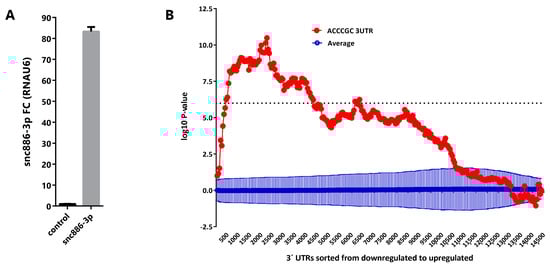 Aiming to discover the snc886-3p effect on gene expression, we overexpressed the small RNA in DU145 cell line (Figure 3A) and performed a global gene expression analysis using Affymetrix gene microarrays 48 h after transfection. We used Sylamer algorithm [53] to estimate the enrichment of all 6-nt k-mers in the 3′ untranslated regions (3′-UTR) of transcripts of the differentially expressed genes. A landscape plot that tracks the occurrence biases of the different k-mers on all transcripts ranked by their differential expression is obtained. We observed that 5′ACCCGC3′, which is the complementary sequence to the snc886-3p seed (6-mer, 2-7-nt), is the most enriched 6-nt k-mer in the 3′-UTR of the repressed transcripts (adjusted p-value < 0.01) (Figure 3B). This finding favors a direct and sequence specific repressive interaction of snc886-3p with the mRNA targets. Furthermore, we identified 1358 DEGs (fold change ≥ 1.5) including 704 downregulated and 654 upregulated transcripts (Table S1). Microarray experiments were confirmed by qRT-PCR of selected transcripts (r = 0.97, p-value < 0.0003) (Figure S2A). Independent snc886-3p overexpression experiments in DU145, LNCaP and PC3 (Figure S2B) demonstrate a similar regulation of these genes in these cell lines (Figure S2C).
