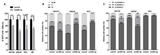 Figure 4. Cytotoxicity, cell cycle and early apoptosis assay in prostate tumor cell lines overexpressing snc886-3p. DU145, PC-3 and LNCaP cells transfected with 20 nM of mimic snc886-3p and negative control (Dharmacon) were evaluated 72 h after transfection. All analyses were performed in triplicates to determine average values and standard error. * p-value < 0.05; *** p-value < 0.001; **** p-value < 0.0001. (A) MTT assay to determine cell viability. p-values of T-test of the individual cell lines and the three cell lines considered as replicates (all) are indicated over the horizontal brackets. (B) DNA content analysis to determine the distribution of cell cycle stages. 10,000 cells/experiment were stained with Propidium Iodide and evaluated by flow cytometry. (C) Early apoptosis assay. 10,000 cells/experiment were stained with Annexin V (Annex V) and Propidium Iodide (IP) and evaluated by flow cytometry. Viable cells are negative for Annexin V and Propidium Iodide, cells positive for Annexin V and negative for Propidium Iodide are in early apoptosis and cells positive for Annexin V and Propidium Iodide are necrotic cells. Two-way ANOVA Test for the cell cycle and early apoptosis assays was used to estimate statistical significance of the observed differences.