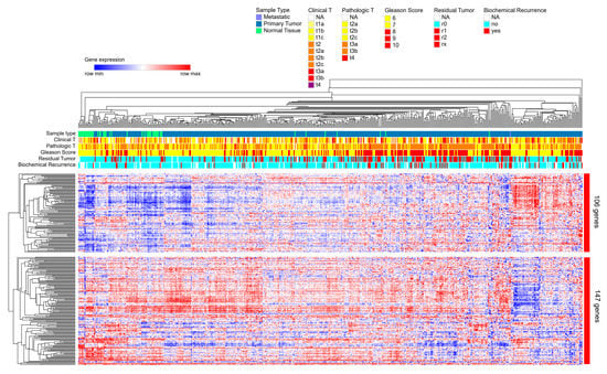 Heatmap was performed by two-way hierarchical clustering using the Spearman rank correlation algorithm using Morpheus (https://software.broadinstitute.org/morpheus/) and gene expression values and clinical status for different parameters (Clinical T value, Pathological T value, Gleason Score, Residual Tumor and Biochemical Recurrence) of PRAD-TCGA dataset.