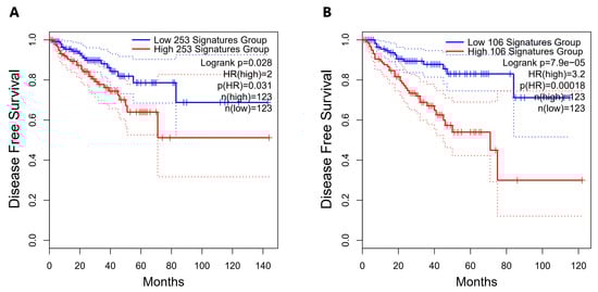 Figure 6. Disease-Free Survival analysis for PRAD-TCGA patients according to the expression of the snc886-3p direct candidate target genes. Disease-Free Survival Kaplan–Meier curve for the expression status of candidate target genes of snc886-3p in PRAD-TCGA was generated using GEPIA2 software [57]. (A) 253-snc886-3p direct candidate target gene list. (B) 106-snc886-3p direct candidate target gene list. Two groups of patient tumors are compared: percentile 25th expression of the candidate target genes (low expression: blue line) and percentile 75th expression of the candidate target genes (high expression: red line). Hazard Ratio (HR), p(HR) and number of patients in each group are indicated. The dotted lines represent the confidence interval of each group.