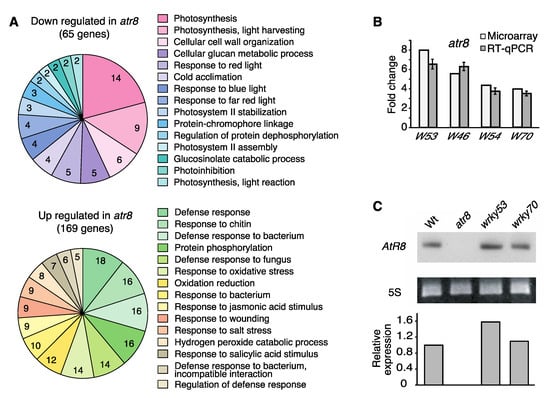 In total, 434 genes were differentially expressed (≥ 2-fold change; p ≤ 0.05) between Wt and atr8. Of these, 145 genes were down-regulated and 289 were up-regulated in atr8 compared with Wt (Supplemental Table S2). Differentially expressed genes were annotated based on gene ontologies (Supplemental Tables S4 and S5) and subjected to hypergeometric distribution tests for both up- and down-regulated genes. The top 15 down-regulated categories are shown in Figure 1A, and a complete list is provided in Supplemental Table S3. Genes involved in cellular biosynthetic processes such as photosynthesis, light response, and carbohydrate synthesis were down-regulated. The Arabidopsis Information Resources (TAIR) Gene Ontology (GO) analysis [37] of down-regulated genes annotated 11 gene products as metabolic process, 10 as nuclear, 13 as plastidic, and five as mitochondrial components (Supplemental Tables S4 and S5). By contrast, a large proportion of up-regulated genes was found to be related to the stress response and defense (Figure 1A, lower panel). TAIR GO annotation analysis revealed that among the up-regulated genes, 26 were categorized as stress responsive and 20 were responsive to abiotic or biotic stimuli, while 14 up-regulated genes were associated with plasma membranes and five were associated with cell wall components. The first obstacle encountered by a pathogen is the plant cell wall; thus, membrane trafficking is key to establishing a rapid defense response [38,39]. Ten up-regulated genes encoded kinases, and eight encoded signal transduction components that may participate in stress responses and defense. In total, GO annotations associated at least 122 of the 434 differentially expressed genes with one or more kinds of stress or defense-related function (Supplemental Table S6). Of these 122 genes, 104 were up-regulated in atr8 compared with Wt. Thus, a large proportion (36%) of the 289 genes up-regulated in atr8 were associated with stress- or defense-related functions (Supplemental Tables S5 and S6).