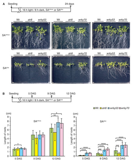 Seedlings from Wt as well as atr8, wrky53, and wrky70 mutants were germinated on a horizontal plane of ½ MS medium with 0.24% (w/v) gellan gum, with or without 20 µM SA. At 10 DAG, seedlings were transplanted onto a vertical plane of ½ MS medium with 0.4% (w/v) gellan gum, with or without 20 µm SA, and grown for 10 more days. The length of the primary root was measured using the ImageJ [68] software package.