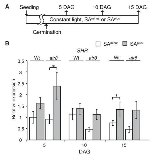 Figure 3. Accumulation levels of SHR mRNAs in Wt and atr8 plants soon after germination. (A) Timeline of experimental procedure. Up arrows indicate samplings. (B) Time course of SHR mRNA accumulations. Arabidopsis seedlings that were grown on vertical 0.24% gellan gum media with (SAplus) or without (SAminus) 20 µM salicylic acid, and total RNAs were extracted at 5, 10, and 15 days after germination (DAG), and subjected to RT-qPCR with ACT2 and ACT8 genes as standards. Bar graphs represent the mean values of three independent assays, and the error bars represent ± SE. Significant differences in RNA accumulation levels between SAminus and SAplus are indicated as * p < 0.05 (Welch´s t-test).