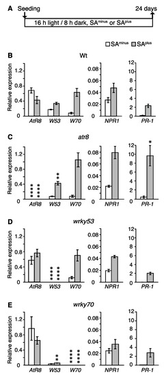 Figure 4. Accumulation levels of RNAs in Arabidopsis under continuous treatment with 20 µM SA. (A) Timeline of experimental procedure. Up arrow indicates sampling. The total RNAs were extracted from the same seedlings shown in Supplemental Figure S2 (24 days after seeding). (BE) The mRNA accumulation levels SAminus or SAplus were compared by RT-qPCR with ACT2 and ACT8 genes as standards. Bar graphs represent mean values of three independent assays (≥50 plants), and error bars represent ±SE. W53: WRKY53, W70: WRKY70. Significant differences in RNA accumulation levels between Wt (B) and each of the mutants (CE) are indicated as * p < 0.05, ** p < 0.01 and **** p < 0.0001 (Welch´s t-test).
