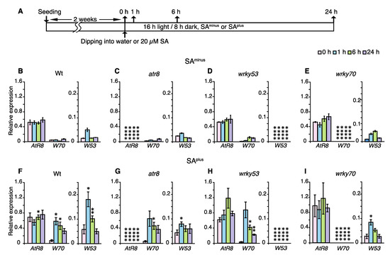 Figure 5. Short-term time course of RNA accumulation immediately after treatment with SA. (A) Timeline of experimental procedure with (SAplus) or without (SAminus) 20 µM salicylic acid. Two-week-old seedlings were dipped once into the water or 20 µM SA and incubated on fresh media (SAminus or SAplus). Up arrows indicate samplings. Accumulations of AtR8 lncRNA as well as WRKY53 and WRKY70 mRNA in Arabidopsis plants were measured by RT-qPCR with ACT2 and ACT8 genes as standards. (BE) Controls that were treated with just water (SAminus). (FI) Seedlings treated with 20 µM SA (SAplus). Bar graphs represent mean values of three independent assays (≥ 50 plants), and error bars represent ±SE. W53: WRKY53, W70: WRKY70. Significant differences in RNA accumulations levels between the same strain SAminus and SAplus (Wt: B and F, atr8: C and G, wrky53: D and H, and wrky70: E and I) are indicated as * p < 0.05, ** p < 0.01 and **** p < 0.0001 (Welch´s t-test).