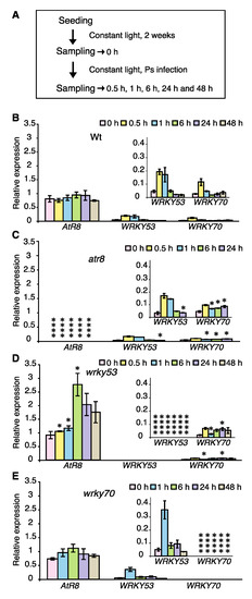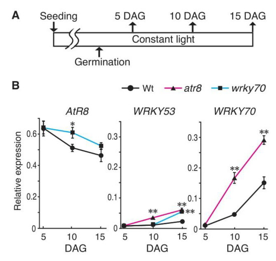 Figure 7. Time course of the RNA accumulations soon after germination. (A) Timeline of the experimental procedure. Up arrows indicate samplings. The Wt, atr8, and wrky70 strains were germinated on 0.24% gellan gum media (without SA and P. syringae), and the total RNAs were extracted after the indicated periods (DAG: days after germination) from each strain, and subjected to RT-qPCR with ACT2 and ACT8 genes as standards. (B) Line graphs represent the mean values of three independent assays (≥ 60 plants), and error bars represent ±SE. Significant differences in RNA accumulation levels between Wt and each of the mutants (Wt and atr8, Wt and wrky70) are indicated as * p < 0.05 and ** p < 0.01 (Welch’s t-test).
