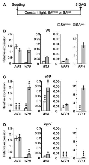 Figure 8. RNA accumulation levels in Arabidopsis plants including npr1 at an early developmental stage. (A) Timeline of experimental procedure. The total RNAs were extracted from the seedlings of Wt, atr8, and npr1, which were grown on 0.24% gellan gum media SAplus or SAminus (20 µM SA), and subjected to RT-qPCR with ACT2 and ACT8 genes as standards. Bar graphs represent the mean values of three independent assays (≥ 100 plants), and error bars represent ±SE. W53: WRKY53, W70: WRKY70. (B) Wt, (C) atr8 (AtR8 null mutant), and (D) npr1 (NPR1 hypomutant). Significant differences in RNA accumulation levels between Wt (B) and each of the mutants (CD) are indicated as * p < 0.05, ** p < 0.01, *** p < 0.001, and **** p < 0.0001 (Welch’s t-test).