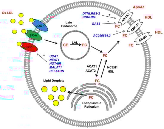 Another lncRNA, termed the “cholesterol-induced regulator of metabolism RNA” (CHROME), was demonstrated to be an imperative component of proper cholesterol homeostasis. Hennessy et al. [85] identified CHROME as elevated in the plasma and atherosclerotic plaques of individuals with coronary artery disease. CHROME expression is influenced by dietary and cellular cholesterol via the sterol-activated liver X receptor transcription factors, which control gene-mediating responses to cholesterol overloads. Using gain- and loss-of-function approaches, the authors show that CHROME promotes cholesterol efflux and foam cell formation, most likely through the regulation of miRNA expression. CHROME knockdown in human macrophages increases the levels of miR-27b, miR-33a, miR-33b, and miR-128, thereby reducing the expressions of their overlapping target gene networks, including ABCA1. Since CHROME is also expressed in hepatocytes, it can play an important role in systemic cholesterol homeostasis in atherosclerosis [85].