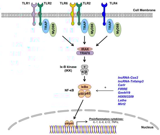 The impact of lncRNAs on Toll-like receptor (TLR) expressions and nuclear factor (NF)-κB signaling in macrophages. LncRNAs (blue) enhance (+) NF-κB signaling and proinflammatory gene expressions in macrophages (details in text).
