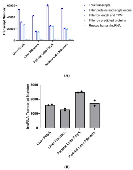 Filtering out known protein-coding and single exon transcripts expressed at low levels resulted in the greatest removal of transcripts for all the samples (Figure 1A). Libraries prepared with rRNA-depletion had more protein-coding transcripts removed across tissues and biologic replicates (Figure S1), and poly-A+ selection yielded more unique lncRNA (Figure 1B). Additionally, as expected, the more complex parietal lobe samples had more unique lncRNA transcripts than the liver samples, which have a more homogenous cellular composition (Figure 1B).