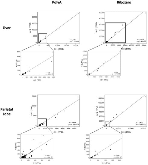 To continue investigating the differences between library preparations, correlation plots were constructed between library preparation methods for each horse and each tissue (Figure 4 and Figure S4). There was only a moderate degree of correlation between library preparations (Spearman r(liver,subset) = 0.476, p = 3.62 × 10−86; Spearmen r(parietal,subset) = 0.473, p = 9.25 × 10−89).
