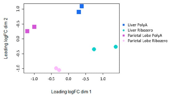 To further address the impact that library preparation plays in defining the lncRNA transcriptome, a multi-dimensional scaling (MDS) plot was evaluated. While tissue type caused the largest difference between samples (dimension 1; x-axis), library preparation caused the second largest difference (dimension 2; y-axis; Figure 3). Principal component analysis (PCA) also showed an even greater difference between tissues when rRNA-depletion was used (PC1 = 70.9%, PC2 = 12%; Figure S3).