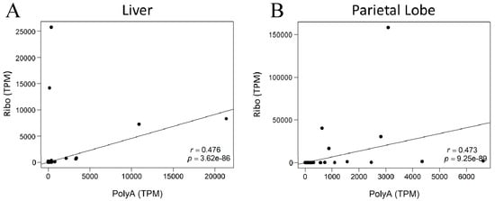 Correlation plots for lncRNA expression in AH1 with annotated transcripts. The x-axis indicates expression of the individual lncRNA in the poly-A+ selected library. The y-axis shows expression of the same lncRNAs in the rRNA-depleted library. (A) Liver (B) Parietal lobe of the cerebrum. Spearman correlation (r) and p-value in bottom right corner.