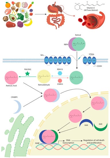 In most species, vitamin A is obtained from diet. Digestion and absorption of this vitamin require successive enzymatic reactions carried out by pancreatic enzymes that catalyse its conversion into retinol, following which it circulates in the blood bound to a specific transporter protein called RBP4 [8] (Figure 1). The interaction between RBP4 and its transmembrane receptor, STRAT6, allows retinol to enter the intracellular space [9]. In the cytoplasm, retinol is subjected to two consecutive oxidative reactions, RA being their final product. In the first oxidative step, retinol is processed to retinaldehyde by the bivalent RDH10/DSH3 enzyme complex [10,11,12] and, in the second phase, RALDH dehydrogenases, particularly RALDH2, catalyse oxidation of retinaldehyde into RA [13,14] (Figure 1).