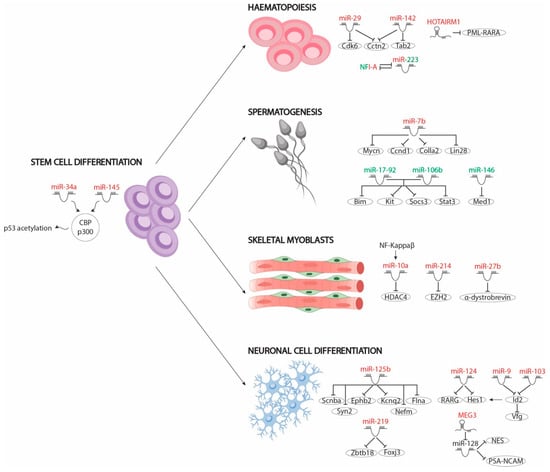 Figure 2. Schematic representation of the different non-coding RNAs involved in RA-regulated differentiation pathways, including stem cell differentiation, haematopoiesis, spermatogenesis and skeletal muscle and neuronal cell differentiation. MicroRNAs and lncRNAs that are upregulated after RA administration are depicted in red while those that are downregulated after RA administration are depicted in green.