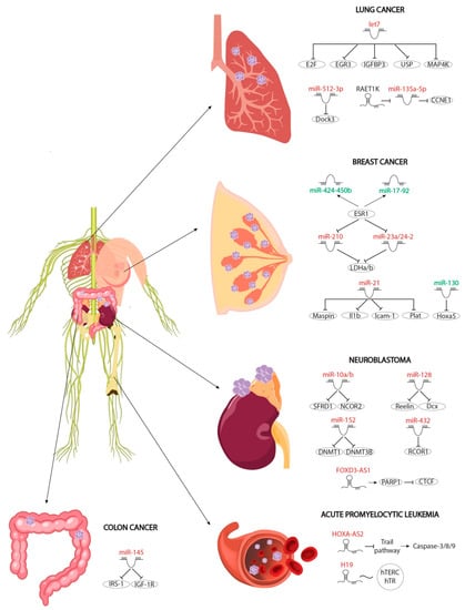 Figure 3. Schematic representation of the different non-coding RNAs involved in RA-regulated oncogenic pathways, including lung and breast cancer, neuroblastoma and acute promyelocytic leukaemia. MicroRNAs and lncRNAs that are upregulated after RA administration are depicted in red while those that are downregulated after RA administration are depicted in green.