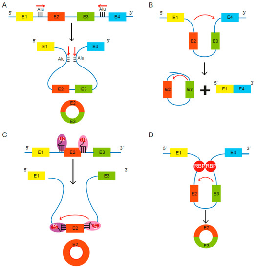 Proposed models of circular RNA (circRNA) biogenesis. Four proposed routes lead to the formation of circRNAs. (A) The pairing of intronic inverted repeat elements flanking either side of the exons leads to formation of circRNA [13]. (B) The alternative splicing mechanism “exon skipping” leads to an mRNA consisting of exons 1 and 4, as well as a lariat structure containing the skipped exons 2 and 3 [27]. (C) Under limited spliceosome activity, a shift from canonical splicing to back-splicing occurs that produces single-exon circRNAs, as cross-exon interactions are not replaced with cross-intron interactions [28]. (D) RNA binding proteins (RBPs) bind to recognition sites in introns near the circRNA-forming splice sites and promote circularization by bringing the circle-forming exons into close proximity [29,30].