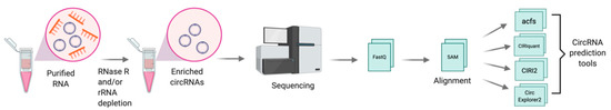 The first step towards the discovery of circRNAs involves the generation of non-polyadenylated transcriptomes. CircRNAs are enriched by depleting ribosomal RNA (rRNA) from total RNA, followed by an optional treatment with RNase R, a 3′-to-5′ exonuclease that preferentially digests linear RNAs, thereby allowing the enrichment of circular RNAs [32]. Libraries are prepared using a stranded total RNA library kit, coupled to paired-end high-throughput RNA sequencing (RNA-seq) [32]. Specific computational pipelines such as acfs [33], CIRIquant [34], CIRI2 [35], and CircExplorer2 [36] are designed to identify reads spanning the back-spliced junctions in reverse orientation (details outlined in Figure 2). To validate and quantify circRNAs in a targeted manner, qRT-PCR using primers designed to the back-spliced junctions can be applied [14].
