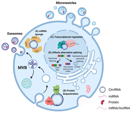Proposed functions of circRNA in cells. In the cytoplasm, multiple circRNAs such as CDR1as have been shown to act as miRNA sponges (A) [38] whereas others possess binding sites for RBPs. For instance, circFOXO3 can act as a protein (CDK2 and p21) sequestering molecule (B) [39]. In the nucleus, circRNAs are able to influence the transcription of their parental genes by interacting with the U1 small nuclear ribonucleoprotein particle (U1 snRNP) and RNA polymerase II (C) [40] and can affect alternative splicing of transcripts, thus altering gene expression (D) [41]. CircRNAs can also be secreted out via extracellular vesicles (EVs) such as microvesicles or exosomes, and enable cell–cell communication [42,43,44]. Adapted from “Extracellular Vesicle Separation by Density Gradient Ultracentrifugation,” by BioRender.com (2020). Retrieved from https://app.biorender.com/biorender-templates.