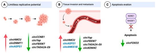 CircRNAs associated with hallmarks of breast cancer. Red arrows depict upregulation and green arrows depict downregulation. CircRNAs in blue are triple negative breast cancer (TNBC) specific. Adapted from “The Hallmarks of Cancer (Classical),” by BioRender.com (2020). Retrieved from https://app.biorender.com/biorender-templates.