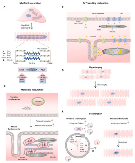 Cardiomyocyte maturation characteristics. (A) Cardiomyocytes undergo myofibril maturation, which is followed by increasing the sarcomere length, assembly and expansion; improvement of sarcomere alignment and M-line formation. (B) Calcium handling maturation is mediated by the development of T-tubules, expression of calcium handling proteins and increased volume of calcium stores of the sarcoplasmic reticulum. (C) Metabolic maturation causes the switch of glycolysis to fatty acid β-oxidation and increases in mitochondria number. The cristae structures in mitochondria are densely organized, and the mitochondria are localized close to the SR and myofibrillar structures to support efficient ATP transition. (D,E) Proliferation-to-hypertrophy transition occurs at the time of maturation. The postnatal heart size is increased through maturational hypertrophy followed by polyploidization (top) cardiomyocyte proliferation rate declines through downregulation of cell-cycle-associated genes (bottom).