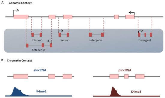 Classification of LncRNA. (A) LncRNAs may be divided based on their position and orientation relative to protein-coding genes (genomic context) or by distinct chromatin marks around their transcription start-sites (chromatin context). (B) More details are described within the text.