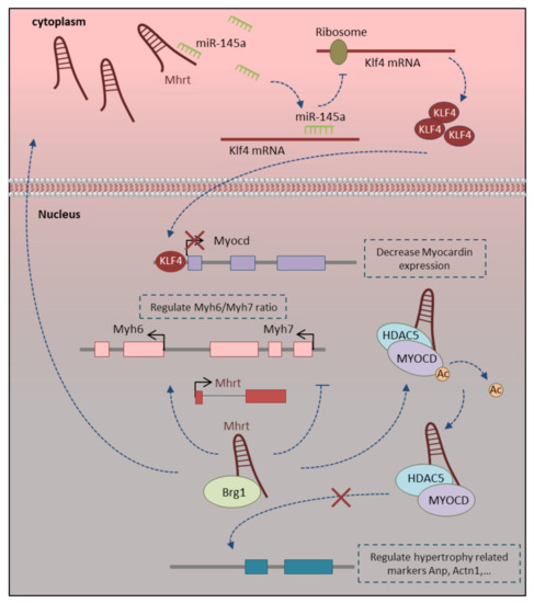 The Myh-associated RNA transcript (Mhrt) is a cardiac-specific lncRNA, which is transcribed within the Myh genomic loci. The Myh genomic locus not only encodes the main cardiac contractile genes, including Myh6 and Myh7 but also miRNAs (miR-208a and miR-208b) and Mhrt lncRNA. Mhrt is transcribed in an antisense direction of Myh6 promoter into the genomic site of Myh7 [77]. The Mhrt expression level is increased gradually from embryonic hearts into mature adult hearts. As a cardiac-specific lncRNA, its expression is limited to the heart with no or minimal expression in other tissues [91]. This lncRNA has a different regulatory function in myofibril formation and hypertrophy at the stage of cardiomyocyte maturation. The lncRNA Mhrt has a tight correlation with the Myh6/Myh7 ratio and regulates their expression during the development through Brg1 inhibition. The BRG1 complex can oppositely regulate the expression of the Myh6 and Myh7 contractile genes through the recruitment of different repressors or activators. It can repress the expression of Myh6 by recruitment of chromatin repressor G9A and DNMT3 on Myh6 promoter and activate Myh7 expression through NFAT1 and AP-1 transcription factor recruitment on the site of Myh7 promoter. Mhrt lncRNA directly binds to the helicase domain of BRG1, which causes BRG1 to be sequestered from its target genomic DNA. This negative regulation of BRG1 by Mhrt is essential for the normal ratio of Myh6/Myh7 during the development and maturation (Figure 3) [77,116]. On the other side, Mhrt regulates cardiomyocyte hypertrophy through myocardin expression and function regulation. In the heart, myocardin, as a strong trans-activator, binds directly to SRF and activates cardiomyocytes restricted genes containing CarG boxes in their promoter region [117]. The Mhrt upregulation in the mature heart avoids myocardin expression out of control and protects the heart in the development process. Mhrt can raise the Hdac5 level and enrich the HDAC5/myocardin complex, which leads to myocardin deacetylation. Deacetylation loses the activity of myocardin to regulate the cardiac hypertrophy biomarkers expression (Figure 3) [91]. Mhrt lncRNA also inhibits the myocardin expression level through ce-miRNA mechanisms. It sponges miR-145-5p in a base-complementary pairing manner, which leads to regulating Klf4 expression as its target gene. Upregulation of Klf4 resulted in myocardin downregulation and development of myocardial hypertrophy (Figure 3) [92]. Briefly, Mhrt lncRNA have important roles at the time of maturation through regulating the expression of hypertrophy related markers as well as regulating Myh6/Myh7 ratio in the mature heart.