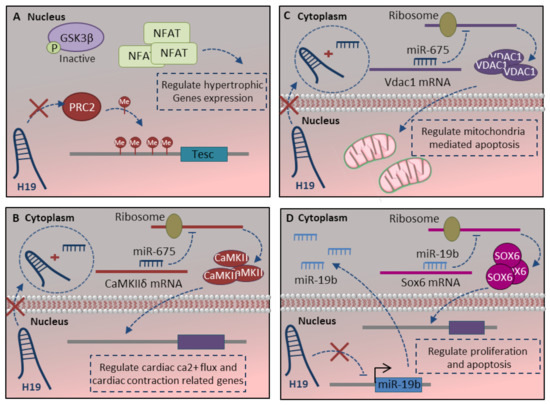 Other studies also indicate the pivotal role of the H19-miR-675 axis in the mitochondrial apoptotic pathway. The voltage-dependent anion channel 1 (Vdac1) is a direct target of miR-675, which is a key protein in the process of mitochondria-mediated apoptosis (Figure 4C) [94]. Moreover, H19-lncRNA regulates proliferation and apoptosis through the miR-19b-Sox6 axis. H19 inhibits miR19b expression, which leads to Sox6 target gene expression upregulation (Figure 4D). SOX6 is a multifunction transcription factor with critical roles in cell proliferation and apoptosis during the late-stage of cardiomyocyte differentiation [119]. Altogether absence of H19-lncRNA regulates the cardiomyocyte apoptosis, proliferation and protects cardiomyocytes by antiapoptotic effect through either H19-miR-675 or H19-miR-19b axis.