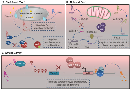 Intracellular Ca2+ homeostasis is a key factor to regulate cardiomyocyte contraction as well as cell viability through regulating mitochondrial-mediated apoptosis. This process is tightly regulated by an array of protein and nonprotein-coding genes. SERCA2a (SR Ca2+-ATPase 2a) is the main protein, which is indispensable for the normal intracellular Ca2+ handling process through regulating the Ca2+ reuptake into SR in cardiac muscles [123]. The more recent studies indicate that Serca2 expression and function are delicately regulated by lncRNAs. Zfas1 (zinc finger antisense 1), an antisense lncRNA to the 5′ end of the protein-coding gene Znfx1, is a cardiac-related lncRNA, which regulates cardiac apoptosis as well as contraction activity [4]. Zfas1 negatively regulates the Serca2a through either its expression repression or functional restriction (Figure 5A). This aims to decrease Ca2+ reuptake to the SR, which leads to cytosolic Ca2+ overload [81]. The studies indicate that Ca2+ overloads cause cardiac dysfunction [81] and induce mitochondria-mediated apoptosis [97].