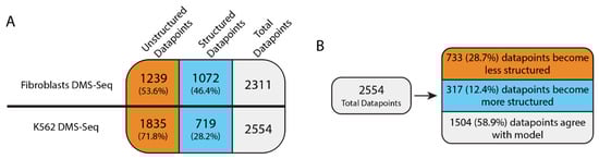 Summary of DMS-Seq data analysis. (A) 2311 available DMS-Seq datapoints (i.e., number of DMS-Seq reads corresponding to a single adenosine or cytidine) in human foreskin fibroblasts and 2554 DMS-Seq datapoints in K562 cells were classified as unstructured or structured based on whether they exceeded the 20-read or 250-read threshold, respectively (see Section 3 and []). (B) K562 DMS-Seq datapoints were compared to the working MALAT1 consensus model and further classified as losing structure, gaining structure, or agreeing with the model [].