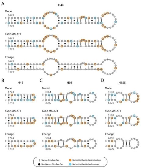 K562-MALAT1 data that corresponded to the loss or gain of structure were mapped onto the noncancerous MALAT1 model to examine how the secondary structure of MALAT1 may vary in K562 cells (Figure 2 and Supplemental Figure S1). Of the 194 hairpins predicted in the noncancerous MALAT1 model, 101 hairpins from the noncancerous model are supported by DMS-Seq data and 59 of these hairpins (58.4%) lose at least half of their base pairs in K562 cells. Among these hairpins are: H44, losing 13 of 25 base pairs (52.0%); H45, losing 5 of 8 base pairs (62.5%); H98, losing 8 of 12 base pairs (66.7%); and H155, losing 4 of 6 base pairs (66.7%) (Figure 3, “K562-MALAT1”). These correspond to novel losses of eight base pairs in H44, four base pairs in H45, six base pairs in H98, and two base pairs in H155 (Figure 3, “Change”). The comparative analysis suggests widespread loss of structural features within the context of K562-MALAT1. While individual nucleotides occasionally appear to gain structure in K562-MALAT1, the sporadic occurrences do not suggest the development of any unambiguous novel secondary structures in MALAT1 in K562 cells (Figure 2). It is worth noting that refolding of the MALAT1 structure based on the K562 DMS-Seq data is expected to produce a novel secondary structure of K562-MALAT1. However, DMS-Seq is the only major RNA structural probing dataset available for K562 cells and it lacks data for about 1600 nts from a central region of MALAT1; therefore, a novel model cannot be constructed and the analysis herein is restricted to identifying regions of MALAT1 that potentially change in K562 cells. Overall, K562-MALAT1 results suggest many hairpins in the working MALAT1 model lose structure, and unstructured regions remain unstructured. This result is in agreement with prior work using DMS-Seq data, which found loss of structure in mRNAs []. Cumulatively, the K562-MALAT1 data indicate general loss of structure in MALAT1, thereby suggesting possible functional ramifications within the context of K562 cells.