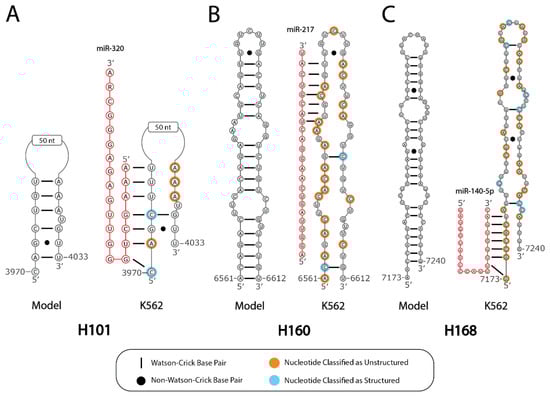 miRNAs are currently known to play a pivotal role in the development and progression of CML []. Of the 98 validated miRNA-binding sites in MALAT1, 28 sites occur in hairpins predicted to lose structure in K562-MALAT1, thereby increasing accessibility of binding site and potential for sponging (Supplemental Table S1). Examples include miR-320, which overlaps with H101; miR-217, which overlaps with H160; and miR-140-5p, which overlaps with H168 (Figure 4). miR-320 is considered a tumor suppressor in K562 cells, but K562 cells often bypass its action by transporting miR-320 to exosomes via hnRNPA1 []. Sponging of miR-320 by MALAT1 in K562 cells could also dampen the tumor-suppressive effects of miR-320, as is the case with lncRNA SNHG12 sponging miR-320 in gastric cancer []. miR-217 reportedly targets the mRNA of oncogenic protein AGR2 in K562 cells []. As decreases in unbound miR-217 accompany AGR2 upregulation and subsequent dasatinib resistance in K562 cells [], sponging of miR-217 by MALAT1 may have similar effects in K562 cells. miR-140-5p has been linked to CML cell apoptosis via targeting of the SIX1 mRNA transcript []; therefore, possible sponging of miR-140-5p by MALAT1 in K562 cells may promote cell survival. These examples highlight how the novel availability of miRNA-binding sites in MALAT1 may aid in K562 cell progression via multiple miRNA-mediated mechanisms.
