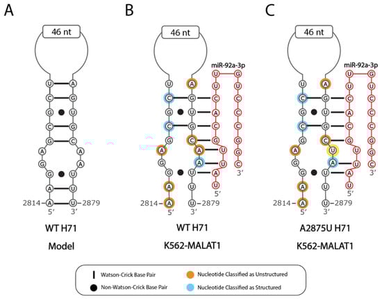 Seventeen SNPs have been identified in MALAT1 []. rs664589 (C4117G), rs115795653 (A6415G), and rs60151940 (C7151W) are three SNPs that correspond to nucleotides that are predicted to lose structure in K562-MALAT1 (Supplemental Table S1). SNPs in structured RNAs are generally believed to alter the local secondary structure [], although the severity of alterations can vary and is difficult to predict []. Interestingly, SNP rs664589 has been characterized as aiding colorectal cancer progression by inhibiting MALAT1-miR-194-5p binding []. Besides SNPs, 655 somatic cancer-associated mutations have been identified in MALAT1 []. Fifty-nine mutations (9.0%) correspond to nucleotides predicted to lose structure in K562-MALAT1 (Supplemental Table S1). Such mutations could further weaken the hairpin structures or reduce miRNA binding, particularly if the mutation were to disrupt base pairing in the seed region of the miRNA-binding site. Within H71, the A2875U mutation alters seed-region base pairing for miR-92a-3p, miR-363-3p, and miR-25-3p (Figure 5 and Supplemental Table S1). Although miR-363-3p is associated with tumor suppression in other cancer types [], miR-92a-3p and miR-25-3p promote progression in cancers like liposarcomas []. Moreover, miR-92a-3p was previously found to aid CML by downregulating C/EBPα and subsequently causing cachexia, i.e., severe weight and muscle loss associated with cancer []. As predicted previously, this proposed role of H71 in regulating MALAT1-miRNA interactions illustrates how H71 can modulate the different outputs depending on the cellular context []. In total, 16 miRNA-binding sites have seed regions within hairpins predicted to become unstructured in K562-MALAT1 (Supplemental Table S1, “SeqMarkup” tab), and may experience reduced binding affinity due to somatic cancer-associated mutations. Additionally, one METTL3/14-binding site, two HuR/ELAV-binding sites, and ten U1-binding sites face similar conditions because of mutations, pointing to complex regulatory pathways that may depend on the K562-MALAT1 structure. Together, the effects of secondary structural loss on miRNA-, U1 snRNA and HuR-, m6A-, SNP-, and cancer-associated mutation-related effects in K562 cells represent potential avenues for further characterization of MALAT1 activity in cancer.