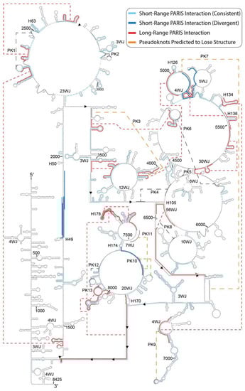 In addition to hairpins, the hypothetical consensus model predicts 13 pseudoknots in noncancerous cells []. As previously noted, m6A5044 is absent in HeLa cells [,,,]. This loss of methylation may result in the loss of PK7 as there is a lack of PARIS data for PK7 (coordinates 5038, 6642) in HeLa cells, as previously reported []. Instead, PARIS reads (coordinates 5038,5145) suggest formation of a local hairpin [], as indicated by the sixth divergent short-range PARIS interaction (Figure 6). Additionally, long-range PARIS interactions suggest structural rearrangement of PK3 and PK9 while the structural rearrangement of PK10 and PK11 is supported by short-range interactions. PARIS data do not predict disruption of any other pseudoknots. Unlike hairpins, pseudoknots typically span long ranges of MALAT1 in the working noncancerous model []. As a result, loss of many pseudoknots would indicate widespread structural changes in MALAT1. While the loss of these pseudoknots signals some propensity for long-range structural changes, the maintenance of eight pseudoknots reaffirms the trend of structural maintenance within HeLa-MALAT1. Overall, most local secondary structural features are retained in HeLa-MALAT1, with rearrangement of select long-range secondary structures and formation of a small number of novel, local structures.