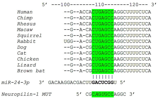 A bioinformatic screening resulted in the identification of hsa-miR-24 as a highly conserved miRNA potentially capable of repressing Neuropilin-1 mRNA expression. The complementary nucleotides between the target region of Neuropilin-1 3’ untranslated region (3′-UTR) and miR-24 are evolutionarily highly conserved across different species, including humans, nonhuman primates, and rodents (Figure 1).