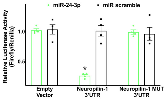 The proposed relationship was substantiated by an experimental validation of seed complementarity, confirming through a luciferase assay the interaction between miR-24 and the 3′-UTR of Neuropilin-1 in hBMECs (Figure 2).
