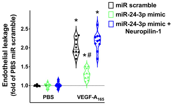 Figure 4. Targeting Neuropilin-1 by miR-24 significantly reduces endothelial permeability. Endothelial leakage triggered by VEGF-A165 (50 ng/mL) was measured in hBMECs transfected with miR-24-3p mimic, miR scramble, or combining miR-24-3p mimic and Neuropilin-1 overexpression; * p < 0.05 vs. PBS, # p < 0.05 vs. miR-scramble. PBS: Phosphate-buffered saline.