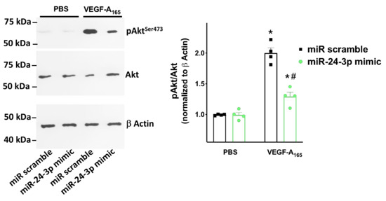 Figure 5. Targeting Neuropilin-1 by miR-24 significantly reduces Akt activation. Akt phosphorylation in Ser473 (representative immunoblots from 4 experimental assays) triggered by VEGF-A165 (50 ng/mL) was measured in hBMECs transfected with miR-24-3p mimic or miR scramble * p < 0.05 vs. PBS, # p < 0.05 vs. miR-scramble. PBS: Phosphate-buffered saline.