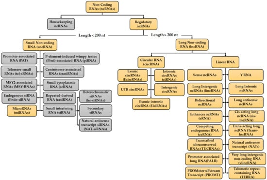 RNAs provide both catalytic and informative functions. With the rapid, increased development of high throughput methods and transcriptome sequencing techniques, scientists have gained a better understanding of both the protein-coding and non-coding portions of the mammalian transcriptome. Most of the mammalian genome is actively transcribed with approximately 2% of the genome encoding proteins [,,]. The remainder of the human genome is known to harbour ncRNAs []. NcRNAs are involved in controlling gene expression before, after and throughout transcription, thus these RNAs participate in regulating and modulating different stages tumour progression, namely cell proliferation, migration, metastasis and chemoresistance []. The advances in the field of ncRNA have been reviewed from different mechanistic perspectives [,,] and biological roles [,,]. Eukaryotic transcription can generate different ncRNA species, which arise from different genomic regions and RNA processing []. Furthermore, different parts of the DNA can be transcribed into ncRNAs, for example protein-coding genes, transposon elements or enhancer regions [,]. Considering their average size and their regulatory role, ncRNA are split up into two groups: housekeeping ncRNAs and regulatory ncRNAs which are then further subdivided (Figure 1) [,,,]. Multiple kinds of ncRNAs have been identified and validated within these two groups, together with their vital functions in both pathological and physiological processes. Most of the identified ncRNA have been linked to different cellular functions, such as gene expression, proliferation, cell cycle progression, apoptosis, and various other functions []. Housekeeping ncRNAs are small (ranging from 50 to 500 nucleotides), constitutively expressed in all cell types and needed for cell viability [,]. Furthermore, this group primarily regulates generic cellular functions [,,,,,]. The regulatory ncRNAs can be further categorized into two groups based on their size: small non-coding RNAs (sncRNAs), which have transcripts not bigger than 200 nt and long noncoding RNA (lncRNAs) which have transcripts greater than 200 nt [,] (Figure 1). These act as key regulatory RNA molecules, which function as gene expression regulators at an epigenetic, transcriptional and post transcriptional level [,,,]. Even though ncRNAs are not present in great abundance and were referred to as ‘junk’ DNA, these still have important roles in transcription, post-transcriptional processing, and translation and are also constitutively expressed and essential for normal function of the cell [,,].