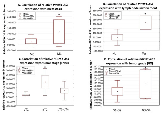 3.1. LncRNA PROX1-AS1 Expression Is Higher in RCC Specimens and Positively Correlates with Metastasis, Lymph Node Invasion, Tumor Stage, and Grade