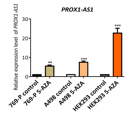 3.2. Methylation Could Regulate PROX1-AS1 Expression in Healthy Kidney and Renal Carcinoma Cells