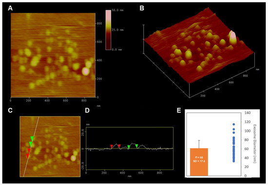Atomic force microscopy (AFM) was performed on isolated exosomes placed on a mica surface in buffer, using a minor modification of our previously published procedure [48,49]. Exosomes were imaged using a Nanoscope IIIa AFM from Digital Instruments. (Santa Barbara, CA, USA). Analysis was performed in the “tapping” mode, using silicon nitride tips with a spring constant of 0.38 N.m−1, and an imaging force of <200 pN. Images were obtained in approximately 5 min at line frequencies of 2 Hz, with 512 lines per image, and constant image gains. Topographical dimensions of extracellular vesicles were analyzed using the software nanoscope IIIa4.43r8, supplied by Digital Instruments.