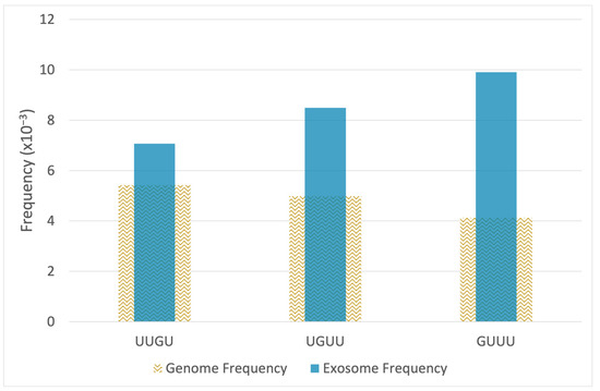 Small RNA-seq was used to quantify and compare microRNA levels in EV of the epileptogenic and non-epileptogenic groups. Thirty-seven microRNAs had a statistically significant increase in epileptogenic EV (p ≤ 0.05) and a minimum 1.5-fold change. We analyzed the sequences of the 37 microRNAs to identify known TLR7/8-activating motifs. Using the top 3 G/U-rich motifs (UUGU, GUUU, UGUU) having the strongest propensity to activate TLR7/8 [17], we tabulated TLR7/8-activating motifs found in each microRNA. This was accomplished by extracting each 4-mer nucleotide in a sliding window across each microRNA sequence and matching it to the three motifs. Of the 37 microRNAs increased in epileptogenic EV, 12 had one or more TLR7/8-activating motifs (Table 1). These microRNAs had a mean increase of 4-fold. In this set, a total of 18 motifs were identified out of a total of 707 4-mers extracted from the 37 increased microRNAs. To determine the significance of this finding, we compared this result to the number of motifs found in the entire set of all human microRNAs. We downloaded 2656 mature human microRNA sequences from miRbase and performed the same motif tabulation, finding a total of 718 TLR7/8 motifs out of a total of 49,418 4-mers extracted from the background set of 2656 microRNA sequences. Analysis of these observed frequencies using the hypergeometric test reveals that the overall set of 37 EV microRNAs is significantly enriched for TLR7/8 motifs (p = 0.017), which are found in the subset of 12 microRNAs shown in Table 1 [18]. Figure 2 shows frequencies of each motif in the EV enriched microRNAs compared to the genome-wide set of microRNAs.